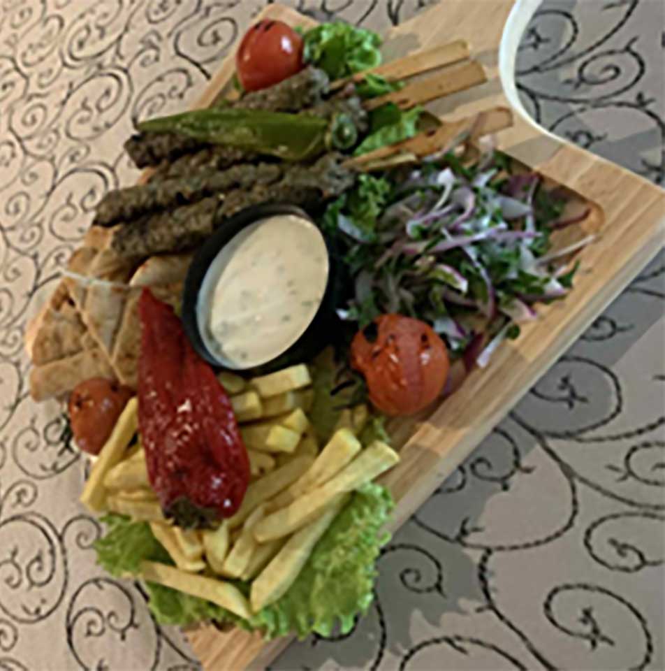 (Pita, carne de vita-oaie, rosii cherry, ardei kapia copt, ardei iute, ceapa rosie, cartofi prajiti, sos iaurt)