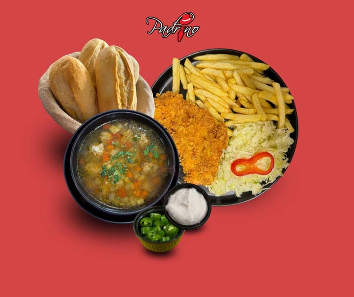 Ciorba de perisoare piept de pui crispy cu cartofi prajiti salata de varza