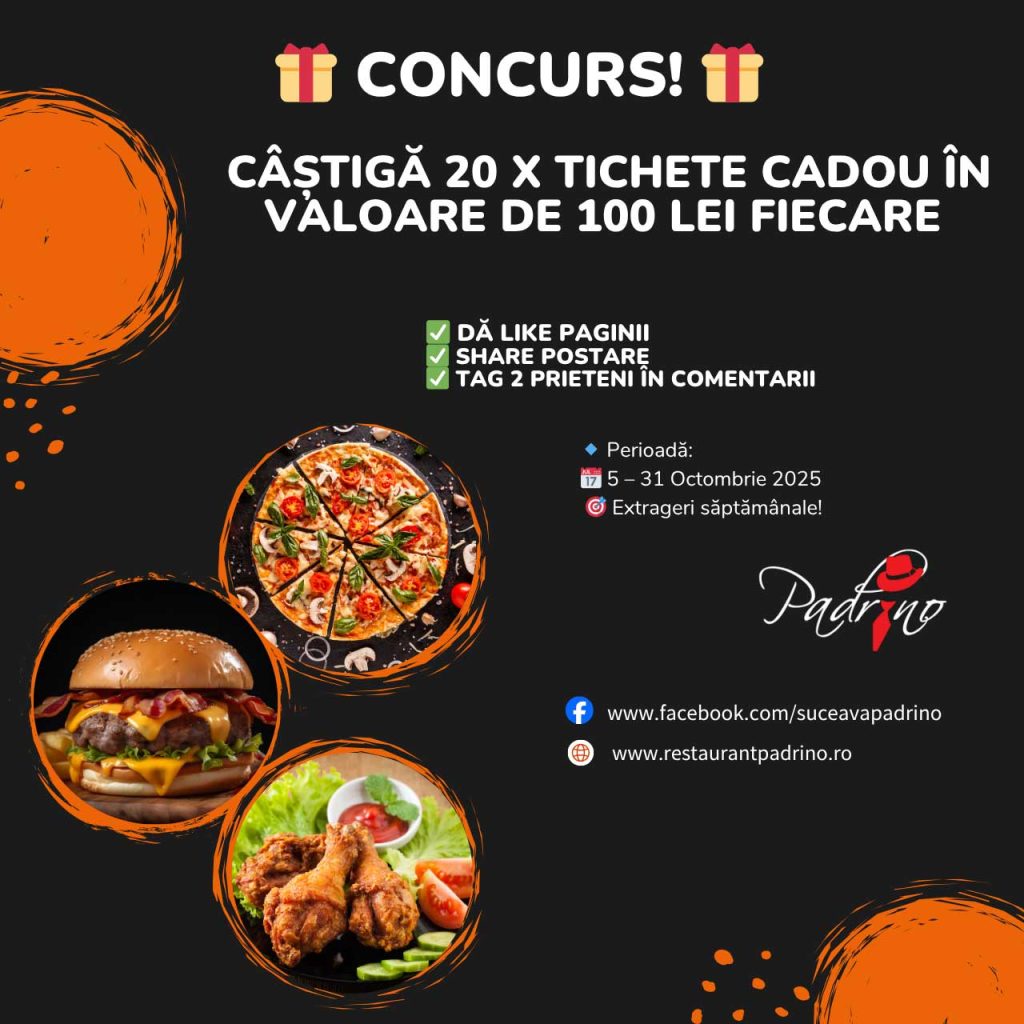 În total vor fi acordate 20 de tichete cadou, fiecare în valoare de 100 lei, valabile pentru consum în locația Restaurant Padrino Suceava.